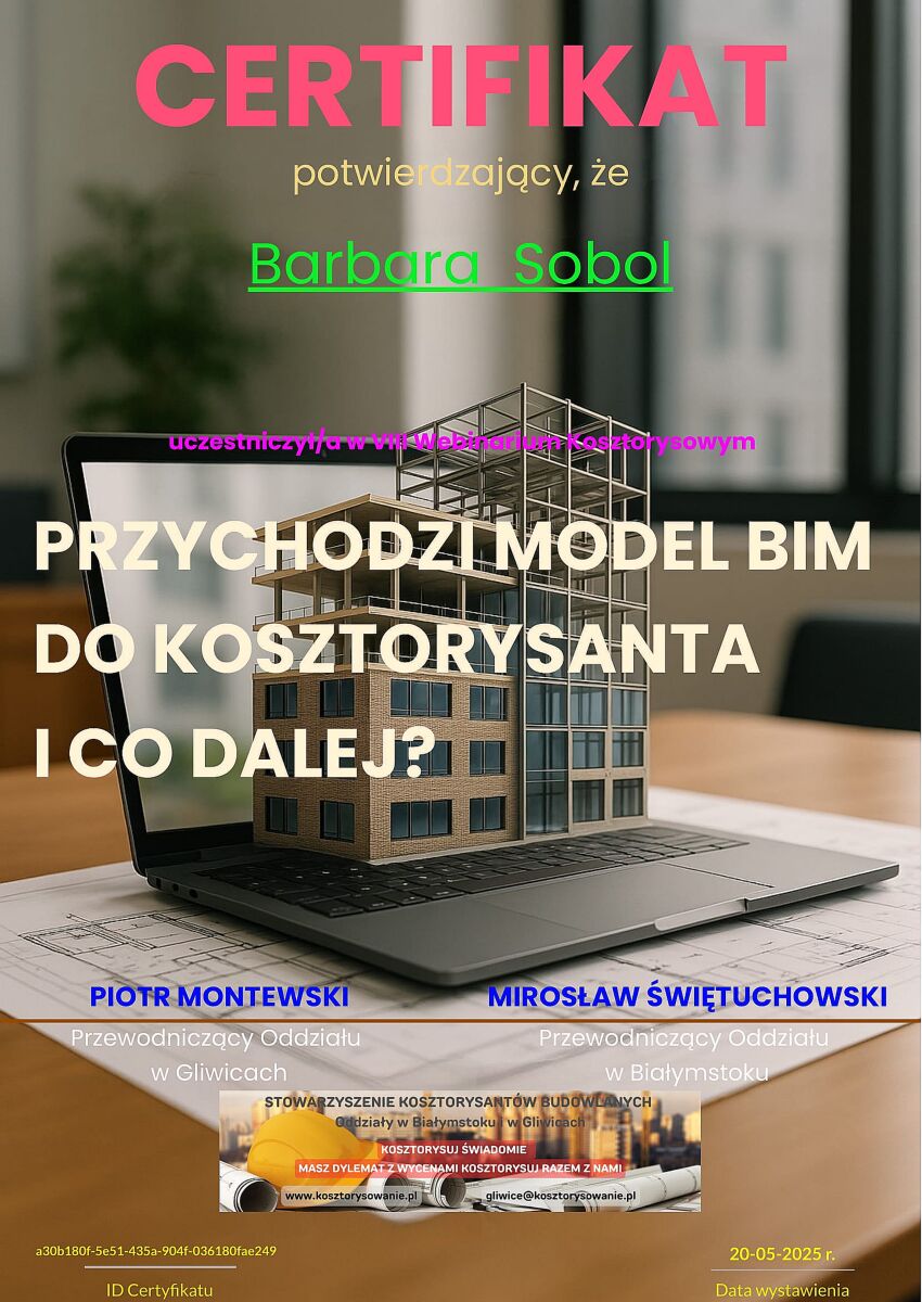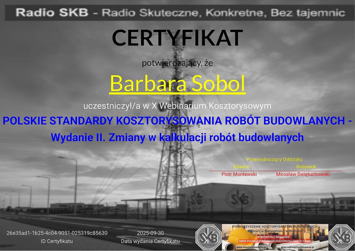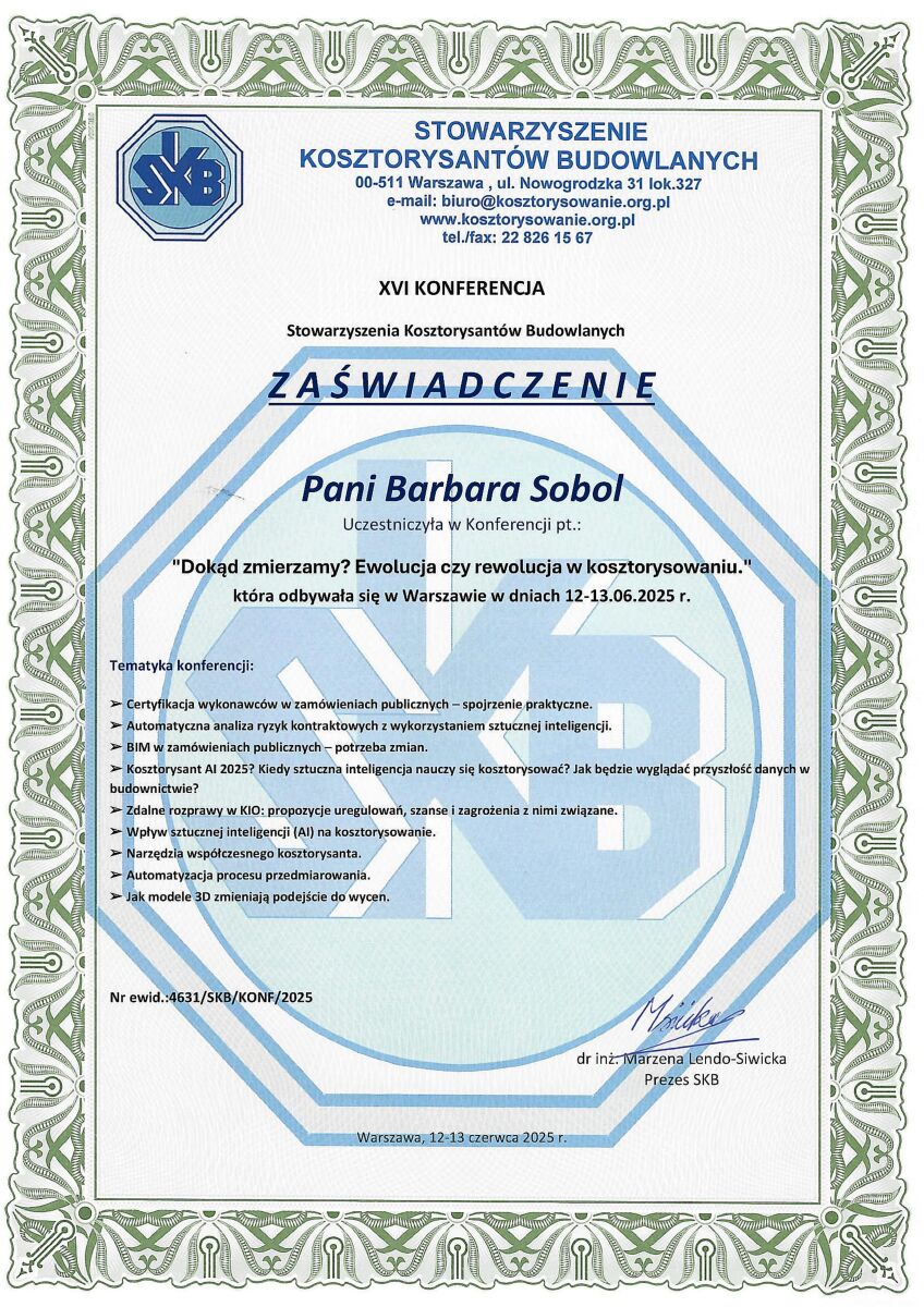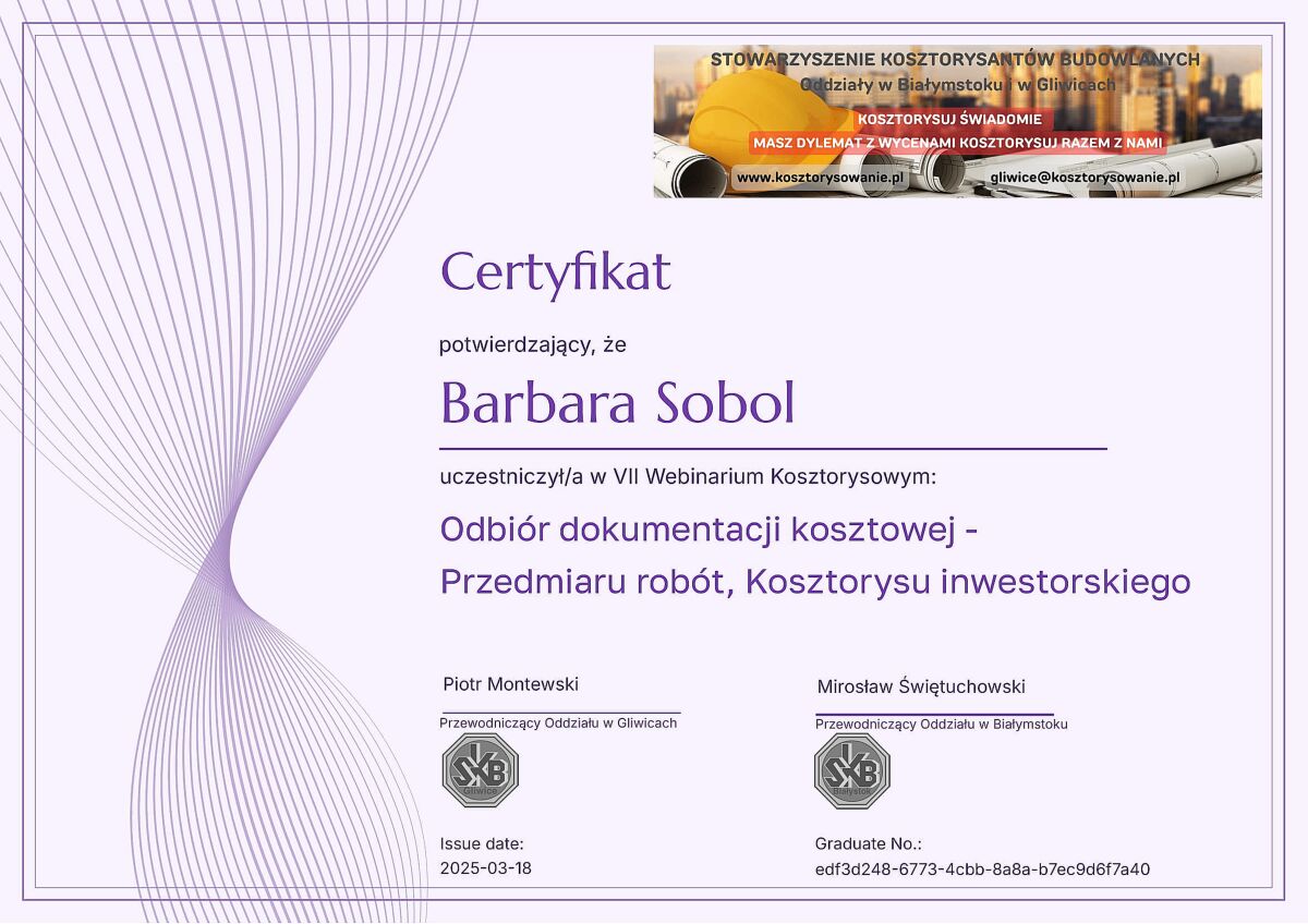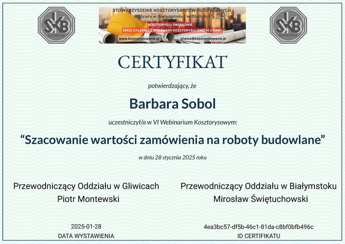 Jestem doświadczonym kosztorysantem, który od lat świadczy usługi na najwyższym poziomie. W swojej karierze miałam okazję pracować nad wieloma różnorodnymi projektami, zarówno dla klientów indywidualnych, jak i dla dużych firm. Każde zlecenie jest dla mnie wyjątkowe i traktowane z najwyższą starannością. Na tej stronie prezentuję kilka z moich najważniejszych realizacji, które najlepiej ilustrują moje umiejętności i doświadczenie.